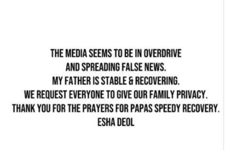धर्मेंद्र यांची मुलगी आणि अभिनेत्री इशा देओल हिने सोशल मीडियावर पोस्ट करत म्हटलं, पापा यांच्या प्रकृतीबाबत अफवांवर विश्वास ठेवू नका. ते सध्या स्थिर आहेत आणि बरे होत आहेत.