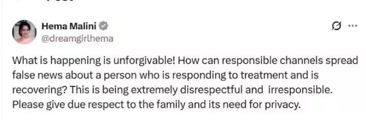 धर्मेंद्र यांची पत्नी आणि अभिनेत्री हेमा मालिनी यांनी खोट्या बातम्यांवर नाराजी व्यक्त केली. त्या म्हणाल्या, जे घडत आहे ते अक्षम्य आहे. एक जबाबदार माध्यम उपचार सुरू असलेल्या व्यक्तीबद्दल अशा खोट्या बातम्या कशा पसरवू शकतं? हे अत्यंत बेजबाबदार वर्तन आहे. कृपया कुटुंबाच्या गोपनीयतेचा आदर करा.