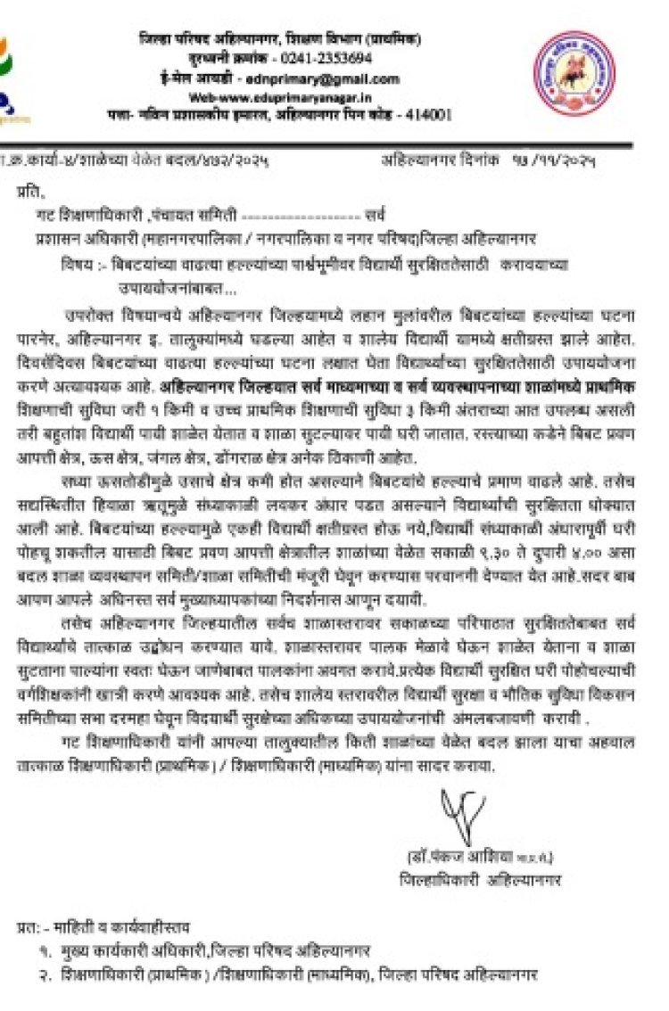 याशिवाय, विद्यार्थी सुरक्षा व भौतिक पायाभूत सुविधा विकास समितीने दर महिन्याला बैठक घेऊन अतिरिक्त सुरक्षाविषयक उपाययोजना आखाव्यात आणि त्यांची अंमलबजावणी करावी, असेही निर्देश देण्यात आले आहेत. समायोजित वेळ स्वीकारलेल्या शाळांनी तत्काळ ही माहिती जिल्हा परिषदेच्या प्राथमिक व माध्यमिक शिक्षण अधिकाऱ्यांना कळवावी, असे आदेश गट शिक्षण अधिकाऱ्यांना देण्यात आले आहेत. तसेच या पत्राची माहिती मुख्य कार्यकारी अधिकारी, जिल्हा परिषद आणि शिक्षण अधिकाऱ्यांना देऊन आवश्यक कारवाई करण्याची सूचना करण्यात आली आहे.