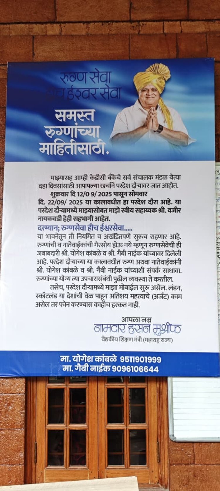 या फलकावर मंत्री हसन मुश्रीफ यांनी म्हंटलेले आहे, परदेश दौऱ्याच्या या कालावधीमध्ये माझा मोबाईल सुरूच असेल. अत्यंत आवश्यक काम असेल तर फोन कराच. या काळात वैद्यकीय सेवा ही निरंतरपणे सुरूच असेल. त्यासाठी सकाळी कागलमधील निवासस्थान आणि मुंबईतील मंत्रालयासमोरील अ - ५ या निवासस्थानी रुग्णसेवेसाठी माणसांची व्यवस्था केलेली आहे.